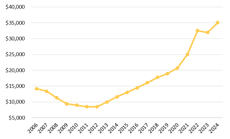 Note: Chart shows Federal Reserve Bank of St. Louis’ U.S. Households; Owner’s Equity in Real Estate from 2006-2024